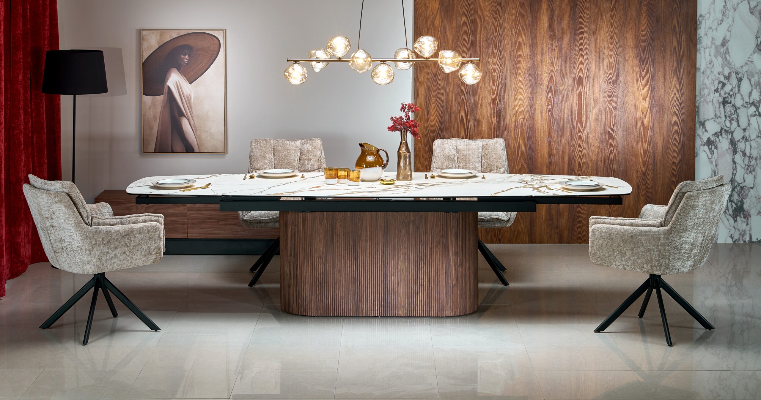 Jeśli chcesz, aby Twoja jadalnia olśniła gości, postaw na modele FLAVOR i VESNA. To propozycje dla tych, którzy kochają luksus w jasnym, wiosennym wydaniu. FLAVOR: Biały marmur połączony z dużą, orzechową nogą wygląda niezwykle prestiżowo. Na takim blacie kolorowe pisanki i wiosenne kwiaty będą prezentować się jak w luksusowym magazynie. VESNA: Beżowy marmur to hit tego sezonu. Jest cieplejszy niż klasyczna biel, dzięki czemu wprowadza do wnętrza przytulną, a jednocześnie bardzo ekskluzywną atmosferę.